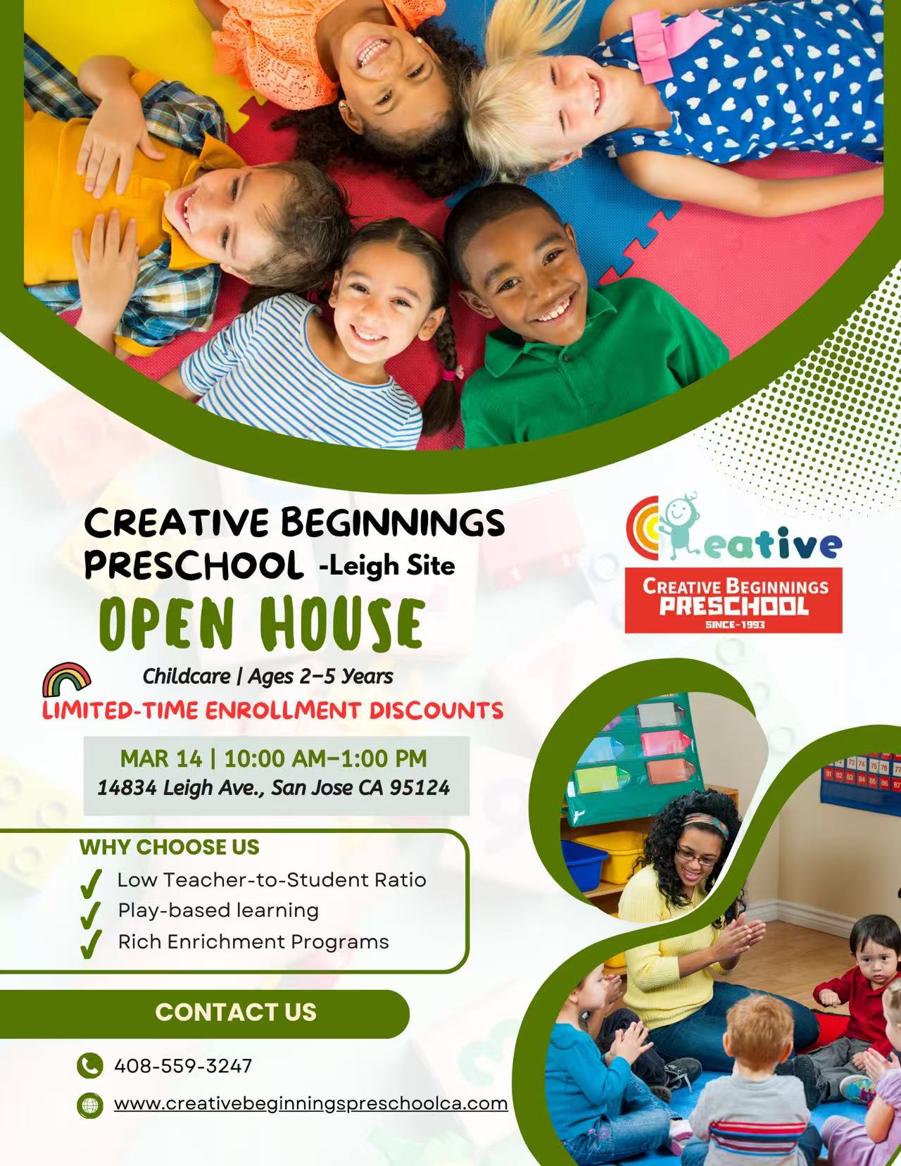 They do field trips for summer and kids really love that. Teachers go above and beyond to make sure the kids are happy and comfortable. We will really miss all the teachers here!”"The school is play based, but with a good academic backbone for learning. My daughter was very prepared for kindergarten. It is a nurturing environment, and they have in the past had a good mix of large and small group time. Creative Beginnings has been a part of our family."
